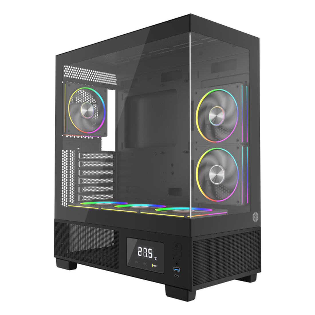 Boîtier PC noir offrant un refroidissement optimisé grâce à six ventilateurs intégrés, une esthétique personnalisable via éclairage ARGB pour mettre en valeur la configuration, et une architecture interne pensée pour une circulation d’air efficace et une présentation soignée des composants.