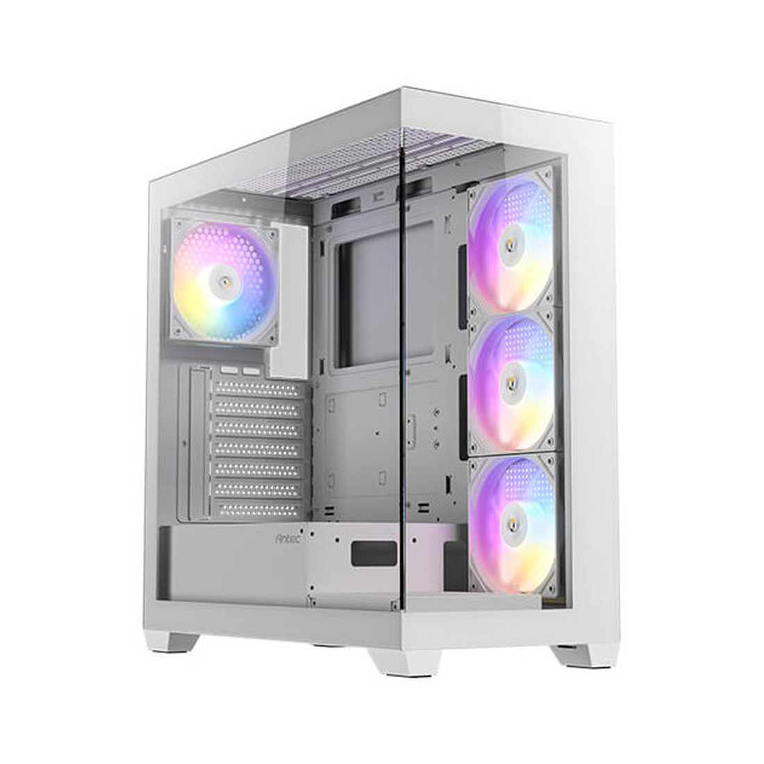 Boîtier PC blanc offrant un flux d’air optimisé grâce aux 5 ventilateurs fournis, un éclairage ARGB personnalisable pour harmoniser votre configuration et un châssis pensé pour accueillir les composants standards, alliant esthétique soignée et refroidissement efficace.